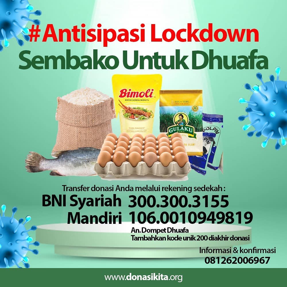 Melalui program #AntisipasiLockDown Sembako Untuk Dhuafa, kami mengajak untuk menyisihkan sedikit rezeki kita untuk kaum dhuafa. Wabah Covid-19 ini tidak ada yang menginginkannya, namun kita bisa bersama saling bahu membahu menguatkan sesama.